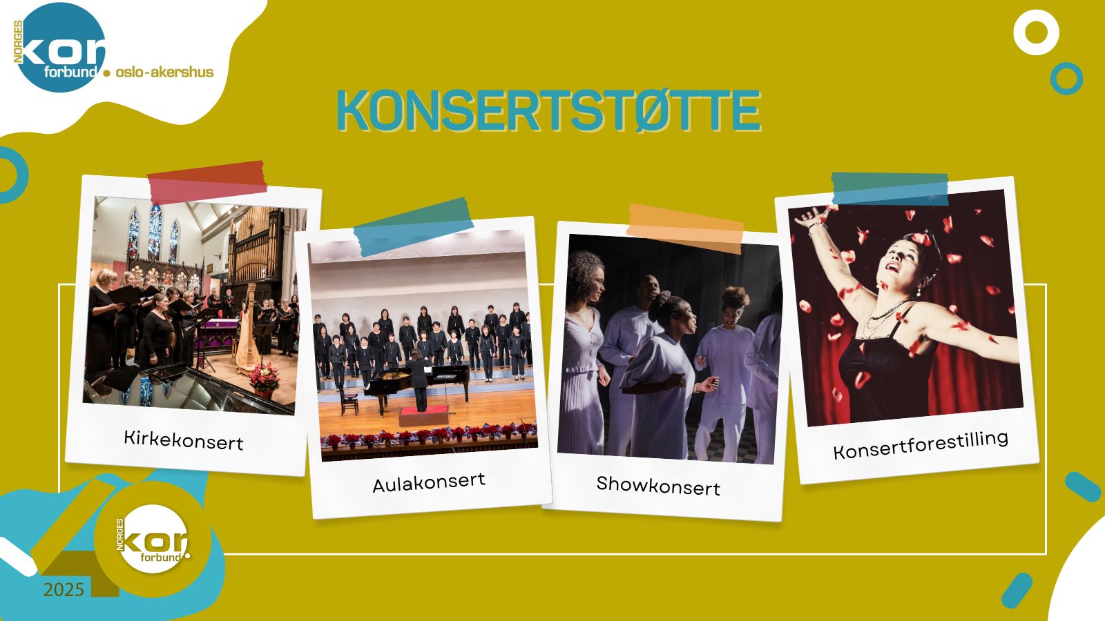 Norges Korforbund Oslo-Akerhus tilbyr økonomisk støtte til våre medlemskor for å gjennomføre konserter. Målet er å stimulere til økt konsertvirksomhet og på den måten bidra til korets publikumsrettede aktiviteter.